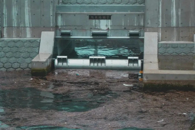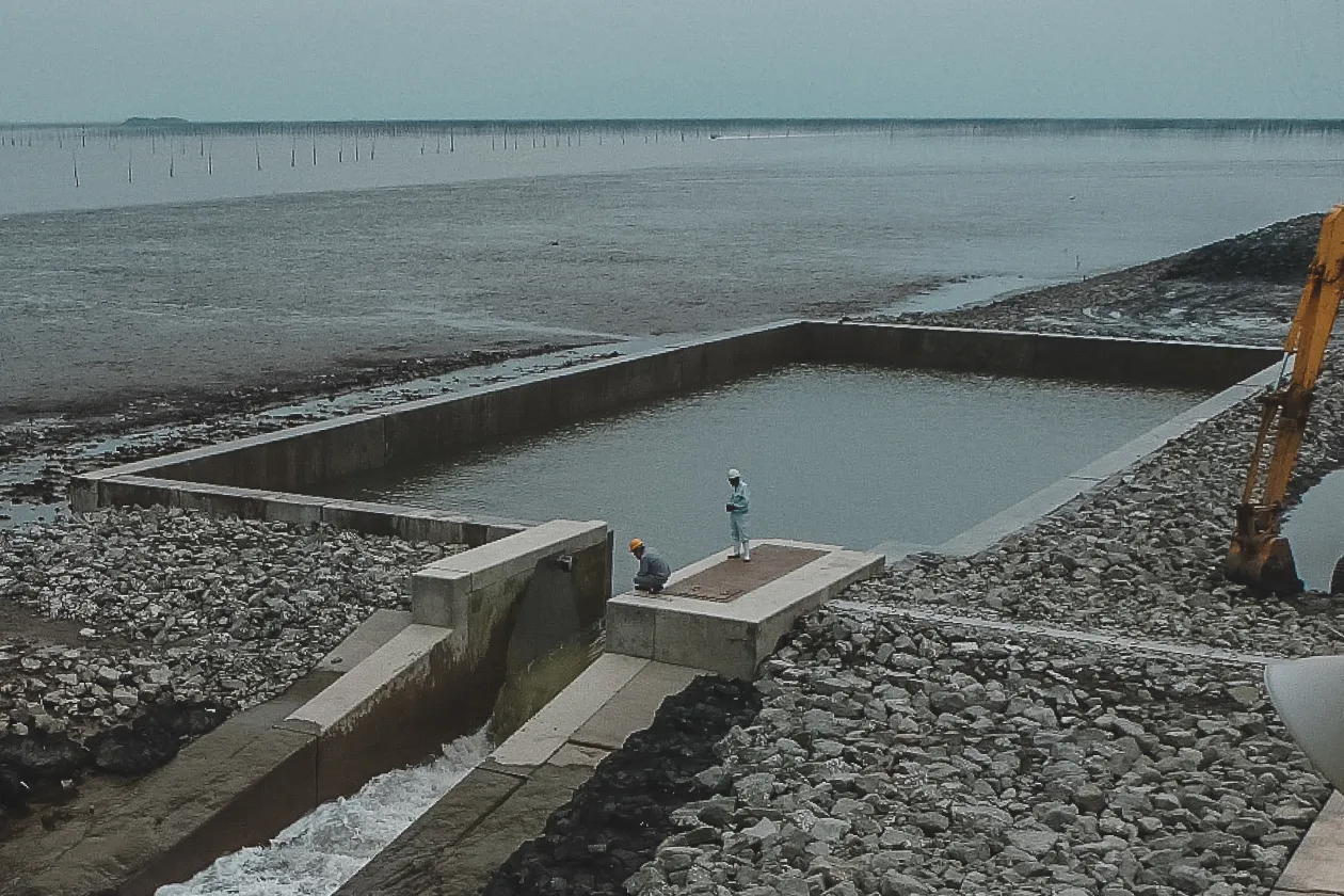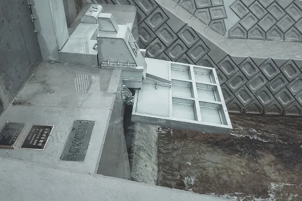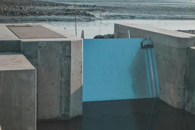 先行設備「佐賀県・七浦干拓フラッシュ設備」の長期運用経過、並びに効果(ミオ筋保持効果等)を基に、平成26年に九州農政局有明海岸保全事務所様によって計画・設置されたフラッシュ設備です。 扉体、戸当、油圧シリンダ等駆動装置は、海水中で長期間、一連(起立・保持・倒伏)の自動作動を繰返し継続して実行することができる、機能・性能の的確性、耐久性を有したものとしています。