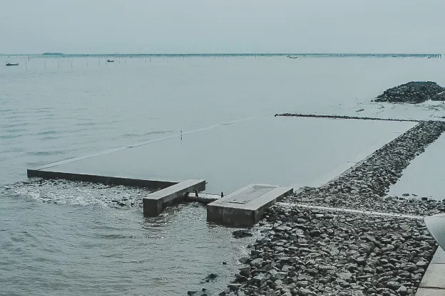 海水貯留プールの出入口に設置された浮体構造起伏の扉体が、満ち潮(水位上昇)時に自動起立、引き潮(水位低下)時に起立保持して海水貯留、干潮時に自動倒伏して貯留海水を放流します。